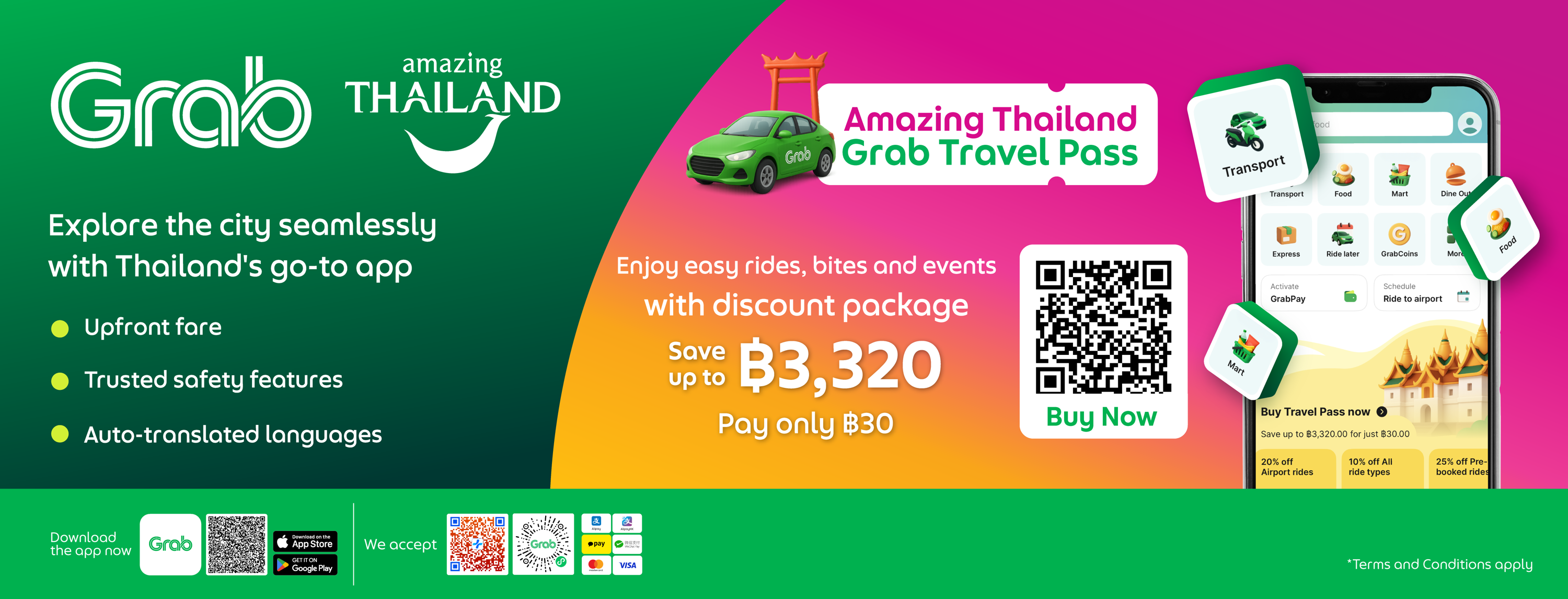 The Amazing Thailand Grab Travel Pass offers over THB 3,000 in total savings for just THB 30, with a validity of up to four weeks—ideal for travelers throughout their stay in Thailand.